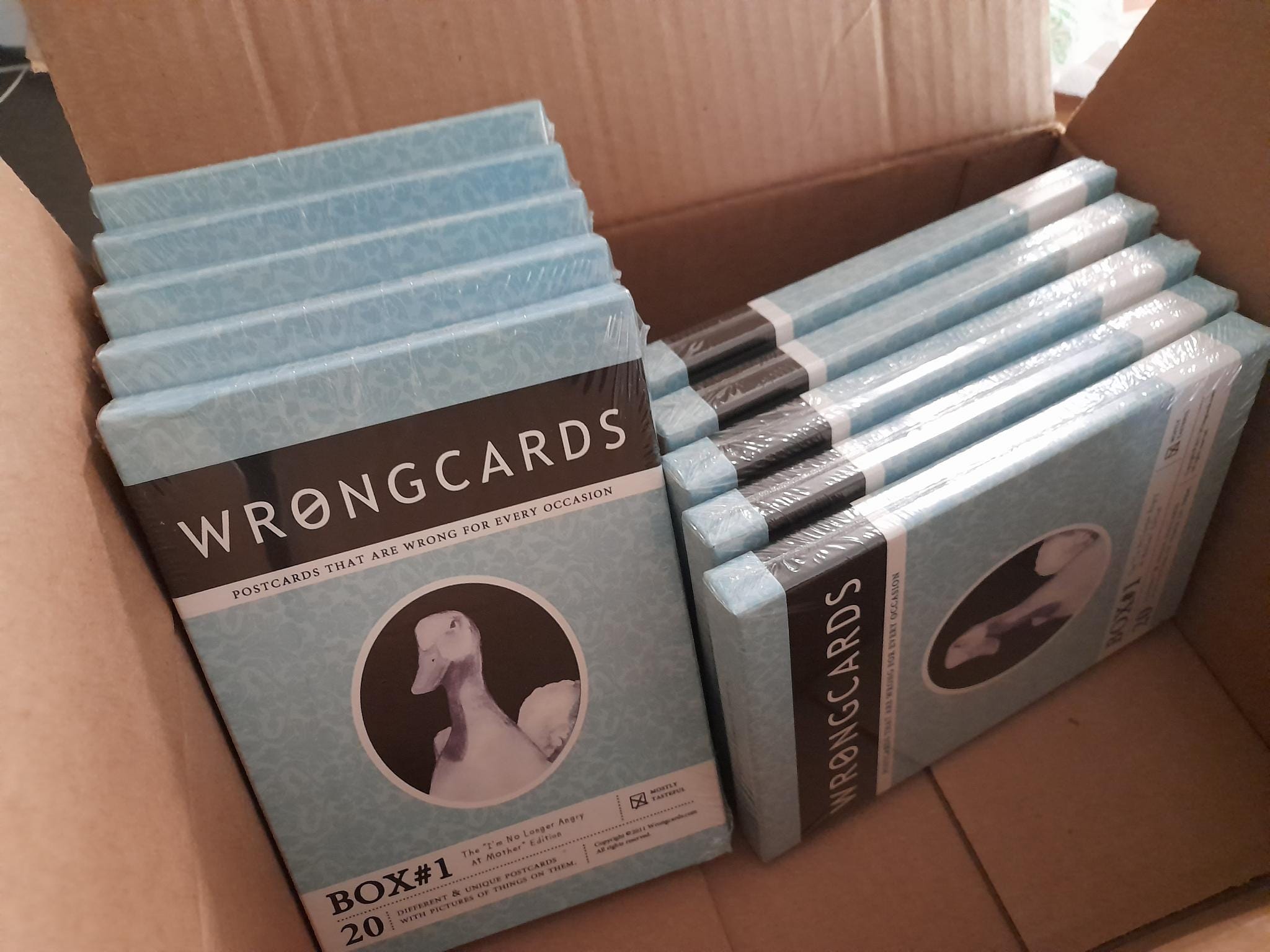 But I put aside some time to set up a shop at Amazon for the postcards. Then I shipped five hundred of the postcard boxes to Amazon's fulfillment center—ie. half the boxes I'd printed—and then I put up a link to them at Wrongcards.